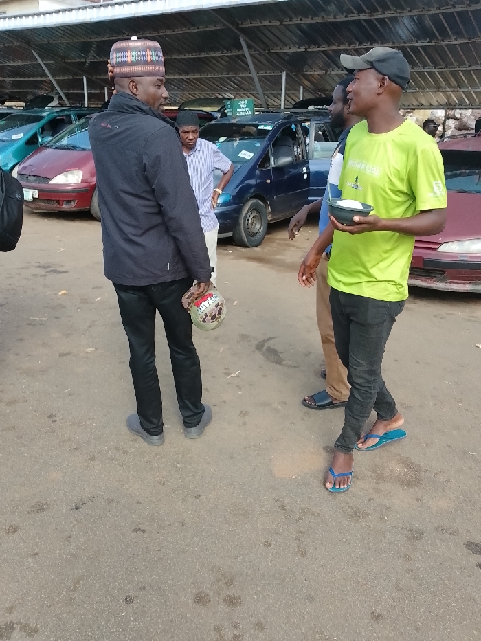 The image depicts an outdoor motor park in Bukuru, Nigeria, as indicated by a prominent green sign displaying "JOS KEFFI ABUJA" in the background