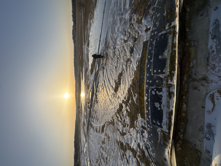 The image displays an outdoor scene at Капцёўскі сельскі Савет, Belarus, under clear skies during sunset or sunrise. In the immediate foreground, the heavily corroded, riveted metallic surface of a large object, likely part of an aircraft fuselage or substantial vehicle, is visible. This surface features patches of dark material, rust, and green biological growth. Beyond this structure, a flat, expansive field extends to the horizon. The ground is characterized by melting snow and ice, interspersed with areas of dry, yellowish vegetation and numerous puddles of water reflecting the bright sunlight. Visible tracks, consistent with vehicle or foot traffic, are impressed into the snowy and muddy terrain. A single individual, dressed in dark winter attire including a hooded jacket, is positioned in the midground, walking away from the camera across the partially frozen field. The sun, a bright yellow-orange orb, is low on the horizon, slightly to the left of the frame's center, creating a strong glare and reflection on the water surfaces. A distant treeline marks the horizon.