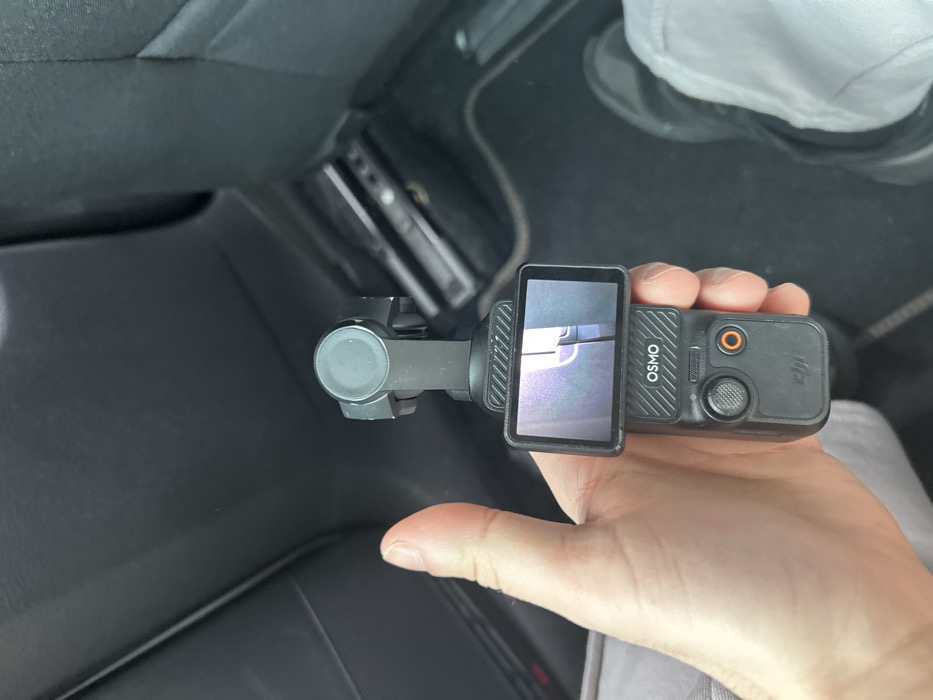 A person's right hand, light-skinned, is holding a black DJI Osmo Pocket camera device in the interior of a vehicle
