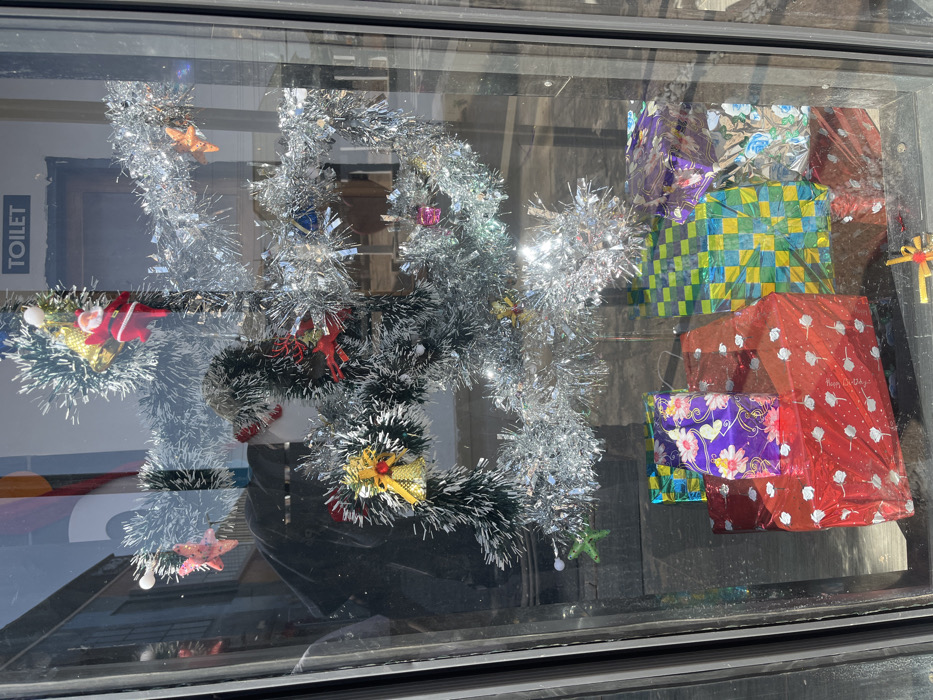 This image captures a display window in Gura Top, Nigeria, featuring a decorated artificial Christmas tree and several wrapped gift boxes