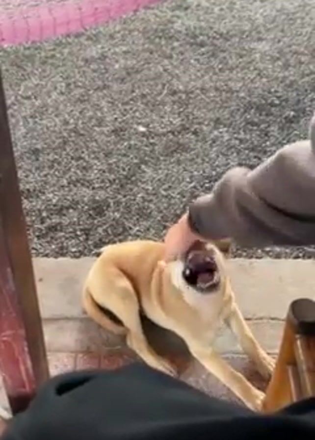A person sitting in a chair pets a small, light-brown dog on the head. The dog looks up, yawns, then pants with its tongue out. The dog is standing on a grey concrete patio with small gravel in the background, where a pink net-like structure is partially visible. The person in the chair is wearing black clothing.