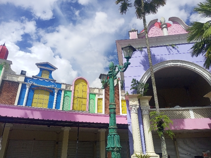 The image depicts a street scene in Gadog, Indonesia, characterized by colorful, European-inspired architecture under a bright blue sky with white clouds. **Subjects and Objects:** The foreground features an ornate, dark green lamppost with intricate scrollwork and a traditional lantern head, positioned slightly left of center. To its right, two light-colored, fluted classical columns with Corinthian capitals support an upper structure. A slender palm tree trunk leans diagonally across the right side of the image, with green fronds visible. The scene is dominated by a row of multi-story buildings, appearing to be commercial or retail structures. The building on the left exhibits a mix of architectural elements, including a reddish-brown textured facade at the lower level, topped by a pink roofline. Above this, a blue section features a central pediment-like element over a yellow panel, flanked by green and white decorative details, and an arched yellow panel to its right. The building on the right presents a large purple facade with a prominent white arched opening on its upper level, above which is a decorative pink gable roof with white scrollwork and a finial. A white lattice railing is visible below the arched opening. Below the pink roof overhang, the ground level of both buildings is uniformly closed with multiple light gray, roll-down security shutters, indicating inactive storefronts or a closed establishment. **Environment:** The sky is clear blue with scattered white cumulus clouds, suggesting daylight conditions. Strong natural light creates defined shadows on the buildings. No individuals, vehicles, or overt activities are visible, presenting a static and unoccupied scene.