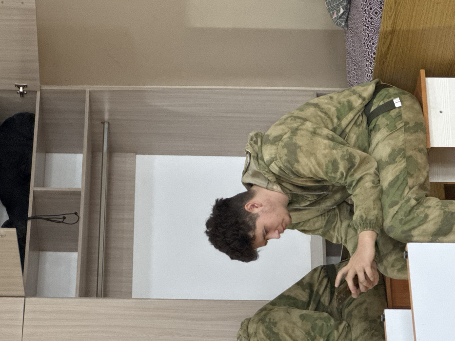 A young man with dark, curly hair wearing a camouflage uniform bends forward. He is positioned near a wooden structure that appears to be part of furniture, with open shelves on the left side. A dark object rests inside one of the shelves. Part of a bed and a patterned bedspread are visible at the top right corner. The man's head is angled down, and his hands are in front of him, suggesting he is interacting with something out of view.