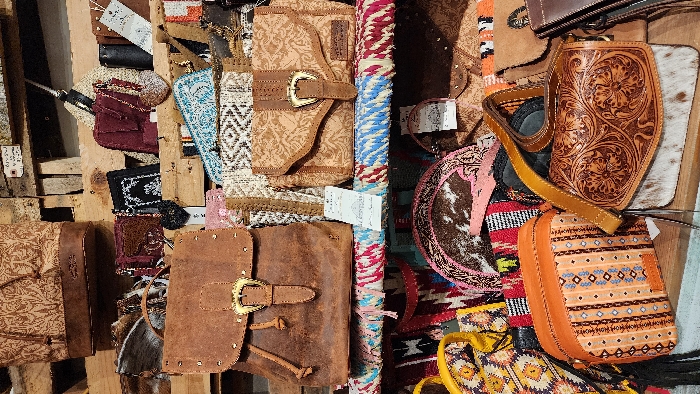 An interior view of a retail establishment in Jackson, United States of America, displays a collection of bags and accessories arranged on multiple wooden shelves. The background consists of rough, horizontal wooden planks. On the top shelf, a light brown fabric backpack with a subtle leaf pattern and a dark brown leather base is visible, alongside smaller purses in dark red and black with white embroidery, and a black cylindrical case. The middle shelf is covered with a red, white, and blue patterned woven fabric runner. Prominently displayed on this shelf is a distressed brown leather backpack featuring a gold-colored buckle, metal studs, and leather drawstrings. To its right, a light brown fabric crossbody bag with a similar leaf pattern, a cut-out leather flap, and a gold buckle is present. Various patterned fabric items, including a white geometric design and a light blue patterned clutch, are also on this shelf. The lower section features an orange leather crossbody bag with a vertically striped, geometrically patterned fabric front. Adjacent to it, a brown leather crossbody bag with detailed floral tooling on its flap overlays a section of white and brown cowhide. Other items visible include a yellow geometrically patterned bag, a pink and black cowhide print item, and various Southwestern-style patterned textiles serving as backdrops or additional merchandise. Price tags are affixed to several items. No individuals are present within the frame.
