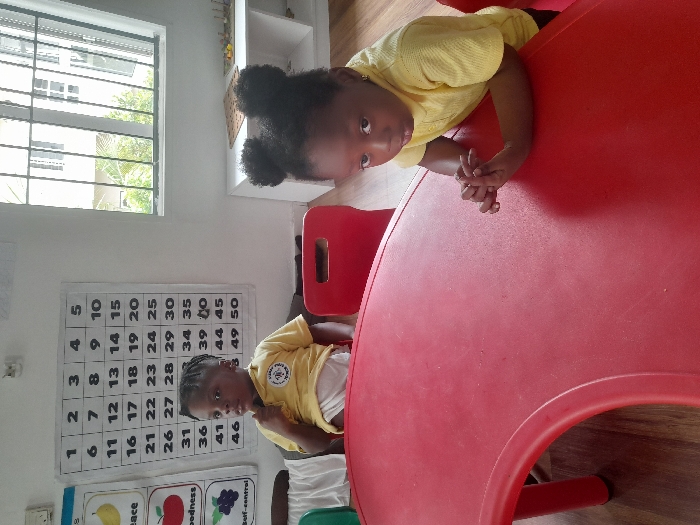 Two young children are observed within a brightly lit classroom or playroom in Lekki, Nigeria