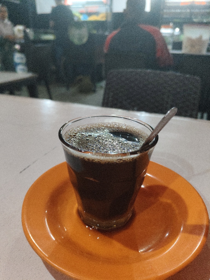 A clear glass containing a dark, bubbly liquid, consistent with coffee, occupies the foreground, positioned on a bright orange saucer. A silver spoon rests submerged in the liquid. The glass and saucer are situated on a light-colored, possibly off-white or beige, tabletop. The background is out of focus, revealing the interior of an establishment, likely an eatery or cafe, located in the city of Rheng, Indonesia. Several blurred human figures are visible in the background. One prominent figure, seen from behind, is seated in a dark chair, wearing a dark garment with a distinct orange or red stripe on the upper arm/shoulder area. Other indistinct figures and partial views of tables and chairs are also present. The scene is illuminated by ambient lighting, contributing to a slight graininess in the image. There are no clear actions or interactions depicted due to the blur.
