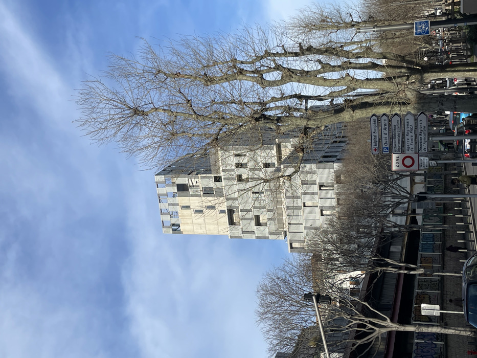 The image depicts a daytime street scene in Marseille, France, identified by visible street signs pointing to "Hôpital Européen" and "Quai d'Arenc," placing the location in the city's Arenc district. In the background, a tall, irregularly shaped modern building dominates the skyline. Its facade combines light-colored concrete with a grid-like pattern of grey and silver panels, featuring varied window sizes and some open sections, particularly towards its apex where an open lattice structure is visible. In the mid-ground and foreground, a wide urban street or boulevard is visible with multiple lanes of traffic. Several cars are present on the roadway. A row of bare, pollarded deciduous trees with distinct knotty trunks lines the right side of the street and extends into the mid-ground. On the left, another line of bare trees partially obscures a lower building with a dark roof and a wall covered in graffiti. Street furniture includes a pole with multiple directional signs in French, a circular "ZONE" sign (red border, red circle on white) indicating a restricted access area, and a blue bicycle path sign. A traffic light signal is visible on the left. Three individuals are present: one person wearing a yellow/khaki jacket stands on a median or sidewalk in the lower-right foreground, facing left. Two other individuals are observed further down the street on the left side, near the graffiti-covered wall. The sky is blue with scattered white clouds, indicating clear weather. The bare trees suggest the season is winter or early spring.
