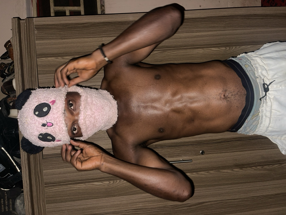 A shirtless Black man lies on a wooden surface, wearing white shorts and a panda mask over his face. His muscular torso is glistening. A bracelet adorns his left wrist. Shoes are visible in the upper left corner and lower left corner. A drawer pull is present to his right. The man’s expression is not visible.