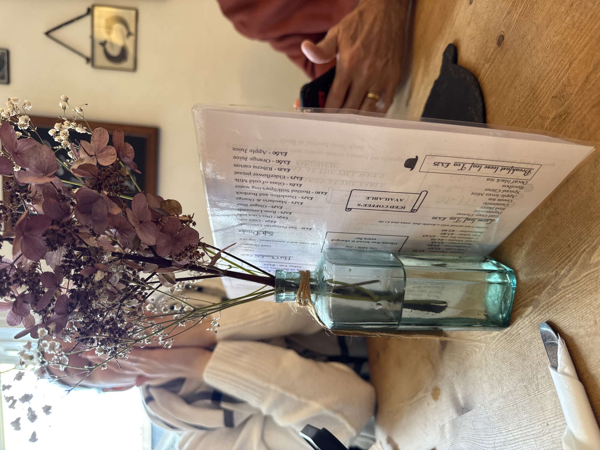 This image depicts an indoor scene within a cafe or restaurant in Ambleside, United Kingdom. The foreground features a light blue-green glass vase containing a bouquet of dried flowers, predominantly maroon-colored hydrangea-like blooms and small white flowers, tied with twine. To the right of the vase, a clear plastic menu stand displays various beverages and food items, including "Breakfast loose leaf Tea £3.25" and "Soft Drinks" with prices in GBP. The items rest on a light brown wooden table with visible grain, where a metal spoon is partially visible, wrapped in a white napkin. In the mid-ground on the left, a person with fair skin, wearing a white ribbed sweater over a striped garment, is seated with their hands near their face, partially obscured by the flowers and strong backlight from a window behind them. On the right, another person, wearing a reddish-brown long-sleeved shirt, is holding a dark smartphone with their left hand; a gold ring is visible on their ring finger. A dark, possibly slate, coaster is partially visible beneath the menu stand. The background shows a light-colored wall with framed decor, including a small, gold-framed piece depicting a reflective C-shape design.