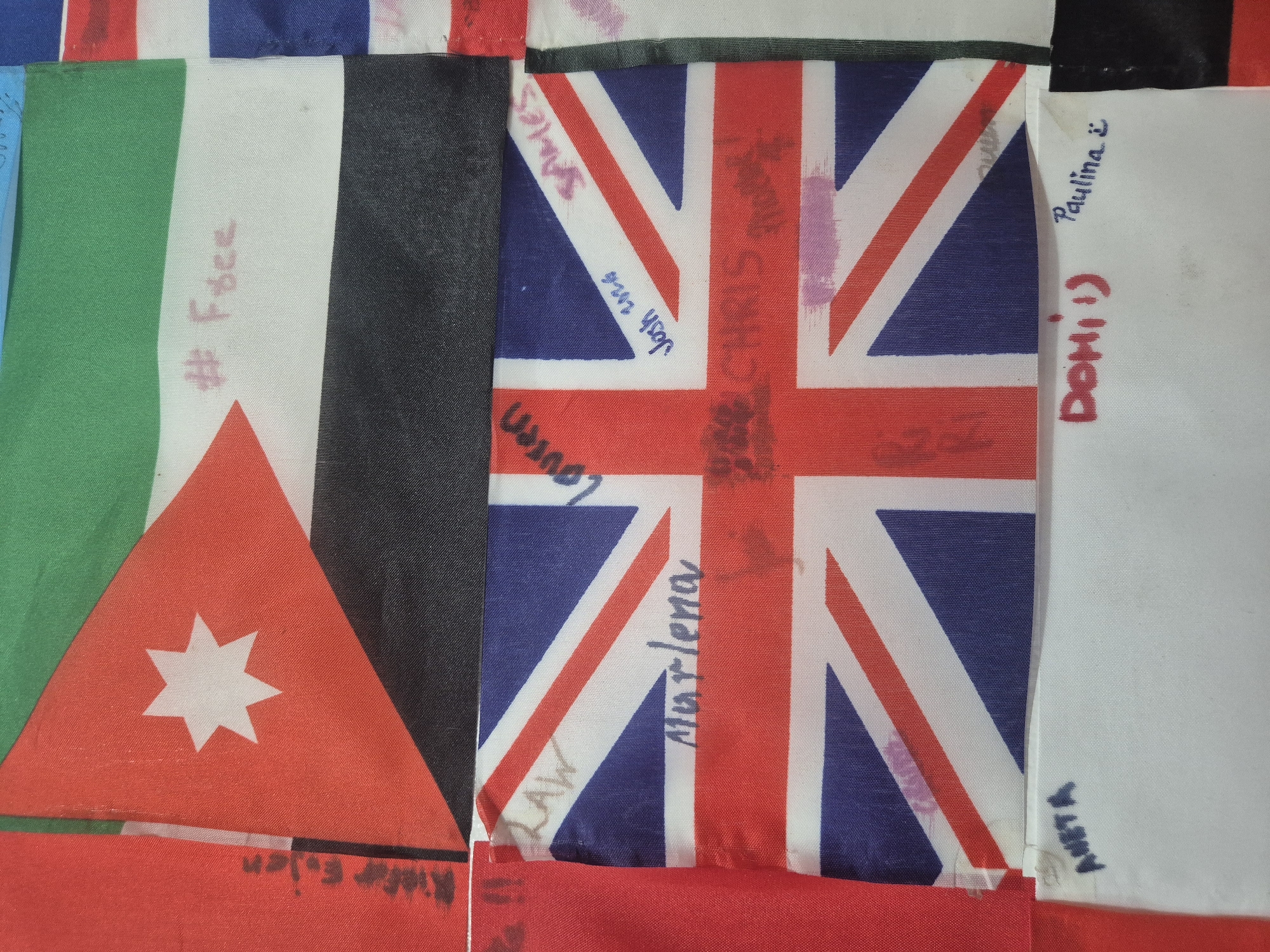 - "The image displays a close-up, overhead view of several fabric sections, primarily depicting national flags, arranged vertically and seemingly stitched or taped together as part of a larger display" by FM-RLBpB3, licensed under CC BY 4.0