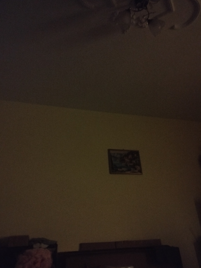 The scene depicts an interior room in Kardzhali, Bulgaria, under low light conditions. The upper portion of the frame shows a ceiling with a damaged or incomplete light fixture, possibly a chandelier, featuring white, structured elements and exposed, non-illuminated bulbs. The mid-ground is dominated by a wall, painted in a light color but appearing dark due to the ambient lighting. A single framed picture, rectangular with a dark border, is centrally mounted on this wall. The specific imagery within the frame is indiscernible. The lower section of the image shows the top surface of dark furniture, possibly a cabinet or dresser. On the far left of this furniture, a soft, light-colored object, potentially a pink textile or plush item, is partially visible. Towards the center, multiple rectangular items, consistent with stacked boxes, are present on the furniture. No individuals or active interactions are visible within the depicted environment.