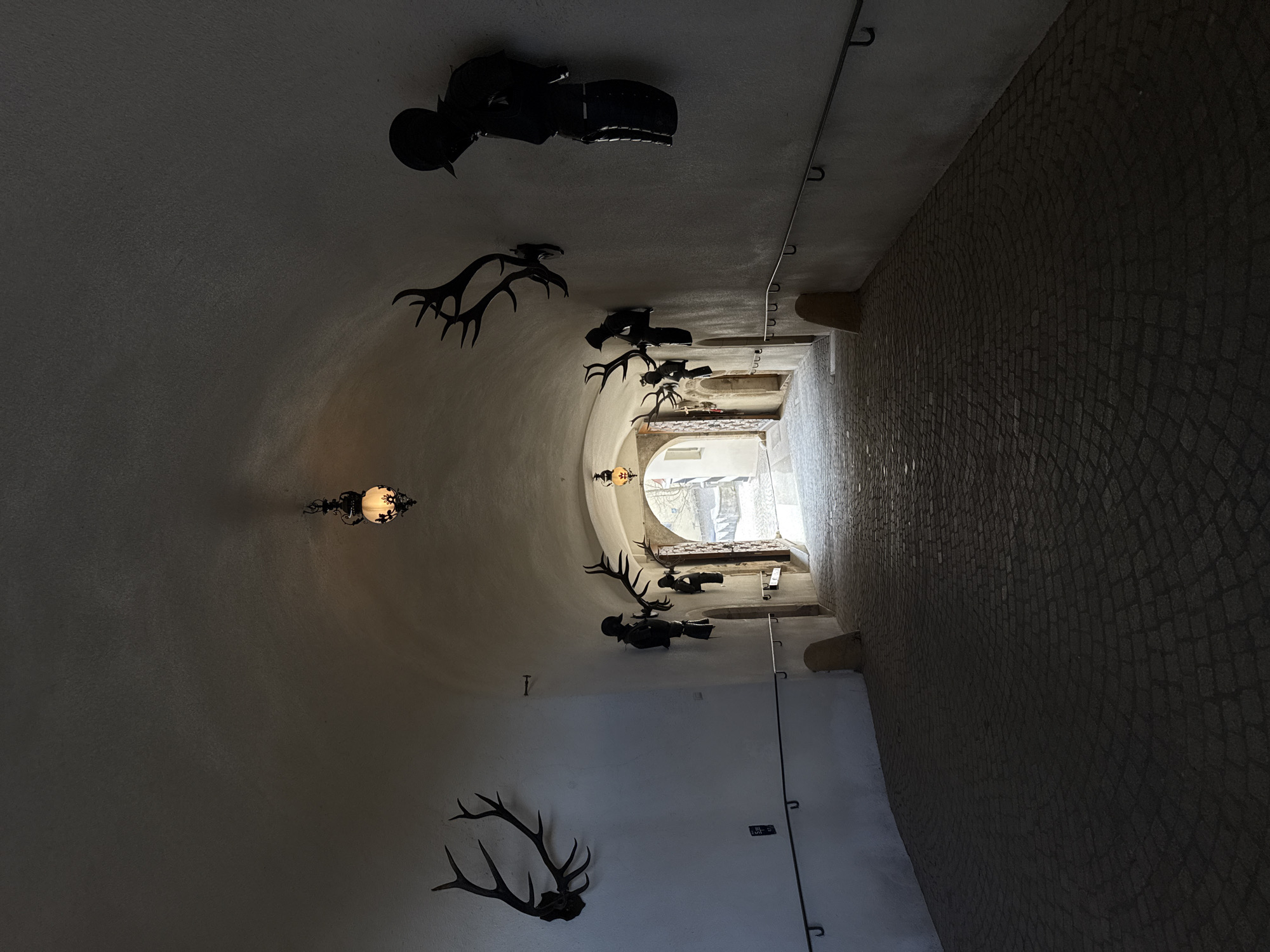 The image displays an arched, dimly lit cobblestone passageway, likely located within or leading to Schloss Sigmaringen in Sigmaringen, Germany. The perspective is from the darker interior, looking towards a brightly illuminated archway that opens to an exterior scene. The passageway features light-colored, textured walls and a vaulted ceiling. The floor is paved with dark, irregular cobblestones arranged in circular patterns, sloping gently downwards towards the exit. Dark metal handrails, supported by U-shaped brackets, are affixed to both walls along the slope. Two ornate, antique-style lamps with dark metal frames and glowing, patterned glass globes are suspended from the ceiling, providing warm internal illumination. The walls are decorated with a series of dark-colored hunting trophies and medieval-style armor elements. On the left wall, a large pair of deer antlers is mounted, with a smaller set of antlers and a dark armored bust visible further down the passage. A small, rectangular dark sign is also present below the larger antlers. On the right wall, a prominent dark armored bust, including a helmeted head and torso, is mounted in the foreground. Further along this wall, a large pair of deer antlers and another armored bust are visible. Through the distant archway, natural daylight strongly illuminates an exterior area, revealing more cobblestones and distant architectural or natural elements. No individuals are present in the scene.