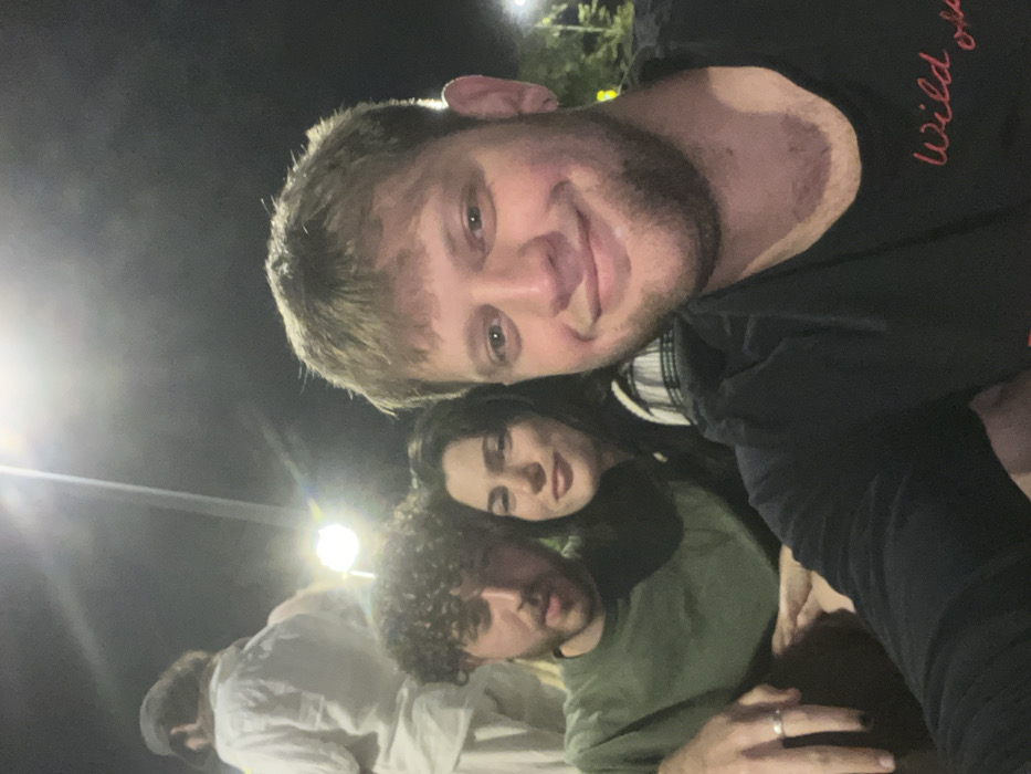 The scene depicts a nighttime outdoor gathering in Modiin-Maccabim-Reut, Israel. Three individuals are positioned in the foreground, posing for a close-up photograph. On the right, an adult male with light brown hair, a beard, and an earring in his right ear smiles at the camera, wearing a dark long-sleeved shirt with red text, partially visible as "Wild." To his left, an adult female with long dark hair and a slight smile wears a plaid shirt over a dark garment. To her left, an adult male with curly dark hair and a beard looks towards the camera with a neutral expression, wearing a dark green t-shirt. His left hand, adorned with a silver ring on the ring finger and dark nail polish, rests out of frame. The male on the left has his arm around the female. In the blurred background on the left, an additional individual is visible from behind, wearing a light-colored long-sleeved garment and a hat, appearing elevated relative to the foreground subjects. Multiple bright artificial light sources are present in the dark background, illuminating the scene.