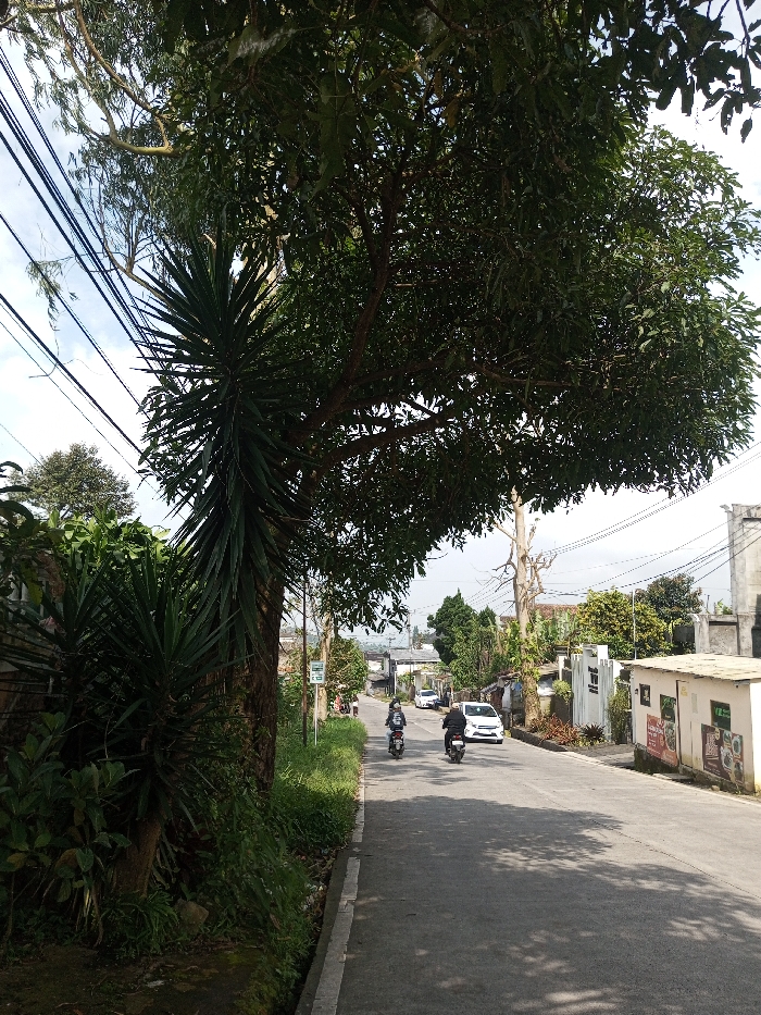 The image captures a daytime street scene in Sandamal Eliya, Sri Lanka, viewed looking down a paved asphalt road that slopes gently downwards. On the left side, a large tree with a thick trunk and dense green foliage dominates the foreground, casting shadows onto the road. Adjacent to this tree, a tall, spiky yucca-like plant is prominent, growing from the ground alongside other green vegetation and grass on a dirt shoulder bordered by a concrete curb. Multiple dark power lines are visible against the partially cloudy sky above the left side of the road. Two individuals on motorcycles are proceeding away from the viewer along the road. The lead rider wears a dark jacket and helmet, as does the second rider following closely behind. Further down the road on the right, a white car is either parked or moving slowly. The right side of the road is lined with various single and multi-story buildings, including a small, light-colored structure featuring several posters on its side, and another building with white walls and an ornate fence or gate. A utility pole with power lines and a bare, dead tree are also visible on the right further down. Additional vehicles are discernible in the distance.