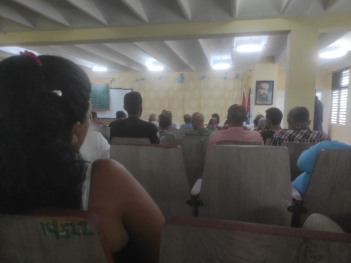 Inside a room, people sit in rows of chairs. A woman with dark hair is in the foreground. Behind her are other individuals with their backs to the viewer. A framed portrait of a man and a Cuban flag are visible in the background. Blue decorations adorn the wall. A blackboard and a window with blinds are also visible. The room is illuminated by ceiling lights.