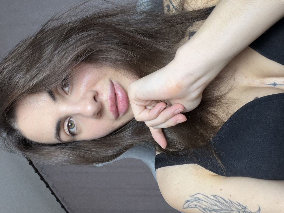 The image displays a close-up portrait of a female subject, stated to be located in the city of Murom, Russia. The subject has long, brown hair falling over her shoulders and back. Her eyes are light green/hazel, directly facing the camera. Her complexion is fair, and she has full lips. Her right hand is positioned with fingers curled, resting against her chin or jawline. She is wearing a black bra or bralette, revealing a visible tattoo of a winged design on her left upper arm/shoulder and a vertical, dagger-like motif on her sternum between the bra cups. A darker, less discernible tattoo is partially visible on her right upper arm, beneath her hair. The background is a plain, light grey wall or curtain, with a faint dark vertical line on the far left and a light grey object, possibly a chair back, behind her left shoulder.