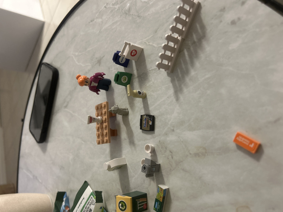 The scene, set on a light-colored, subtly veined tabletop in the city of Bulli, Australia, depicts a miniature arrangement of Lego elements. In the foreground, a female Lego minifigure with orange hair, wearing a purple top and blue pants, stands upright. A light brown Lego table, topped with a small white tube, is positioned near her. To the left of the table, a gray Lego cat figure stands on all fours. Around these central figures, various other Lego accessories are arranged: * Three miniature shopping bags are visible: one green with a white "W" logo, one blue with "BIGW" text, and one white with a red heart symbol. * A yellow Lego bottle with a spray nozzle and a black Lego tile labeled "finish dishwasher cleaner" are situated near the shopping bags. * To the left, a dark green Lego recycling bin with a yellow lid and recycling symbol is present. * Further left, a gray Lego object, possibly an appliance, is paired with a small white Lego cup. * A green Lego tile or package with partially visible text, possibly "everyday essentials" or "collections," is also present. * In the lower right, a segmented white Lego picket fence is laid out horizontally. * An orange Lego tile with white text, potentially "everyday rewards," lies in the lower center. * To the far upper left, a torn green package wrapper is partially visible. The background elements, out of focus, include a dark smartphone resting flat on the table, a tall cylindrical object (possibly a cup or container) to the far left, and a white rectangular object on the far right. The overall arrangement suggests a static diorama of daily life elements.