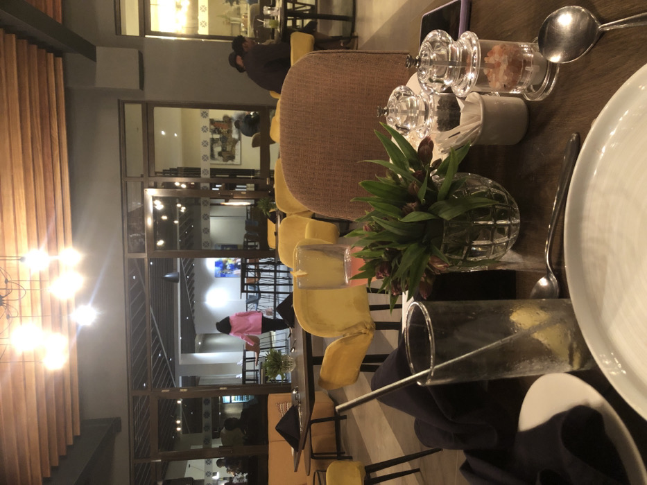 This image depicts a modern restaurant or cafe interior located in Nairobi, Kenya. The scene is viewed from a seated perspective at a dark wooden table in the foreground. On the table, there are two empty white ceramic plates, silver spoons, and a dark cloth napkin. A tall, clear glass contains ice, a lemon slice, and a metal straw. Adjacent to this, a clear vase holds a green foliage arrangement with reddish-purple buds. To the right, two clear grinders, one containing black peppercorns and the other pink salt crystals, are present, alongside a small white ceramic holder with white packets. A glass containing a pink beverage is partially visible behind the vase. The back of a light brown upholstered chair is visible on the right side of the frame. Beyond a glass and dark-framed partition, another section of the establishment is visible, furnished with numerous yellow upholstered chairs and dark tables. A single individual, wearing a bright pink long-sleeved top and dark trousers, is observed walking away from the viewer towards the rear of the establishment. Other indistinct patrons are visible, seated at tables on both the far left and far right of the background. The ceiling features exposed wooden beams with multiple modern pendant light fixtures emitting a warm glow. Walls are predominantly light grey. Artworks are visible in the background, including a prominent blue abstract painting. The overall lighting is warm, contributing to a contemporary dining ambiance. The precise street location within Nairobi cannot be determined from the image.