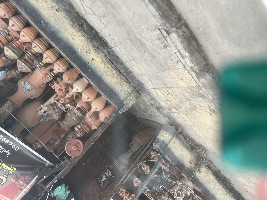An array of earthen vessels, including vases and pitchers, are arranged on a tiered display within a shop. Their forms range from small, simple shapes to larger, more ornate designs. The shop's awning is visible, with some signage. The adjacent sidewalk is cracked and uneven, leading away from the display. Other goods, possibly textiles, are partially visible below the earthen pots.
