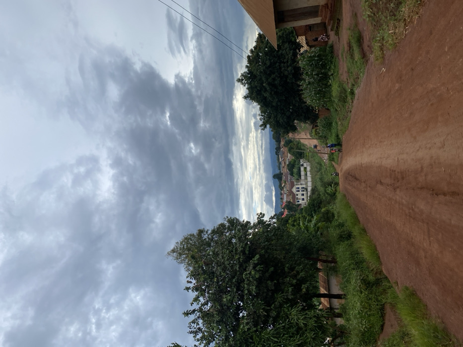 dirt road in Mbinga, Tanzania (latitude: -10.947, longitude: 34.997) leading to a small town in the distance. The road is surrounded by trees and vegetation, and a few people are walking on it. In the background, there are several houses with white walls and brown roofs. The sky is cloudy, and there are a few power lines visible.