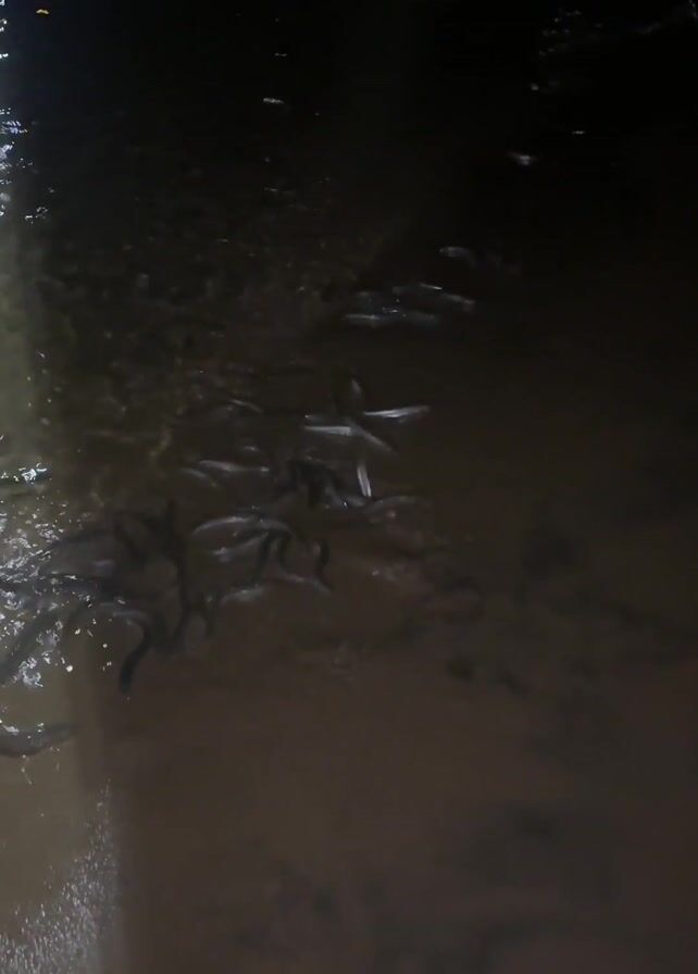 dark, murky body of water. There are numerous small, silver fish swimming in a group. Some bubbles are also visible in the water. The background is mostly black with some blurred bright spots that could be lights from a distance. There is a white concrete object partially visible in the top right corner of the frame. The water surface is slightly disturbed.