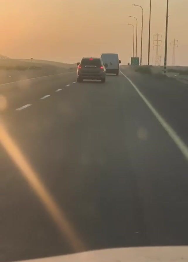 first-person perspective from inside a vehicle driving on a highway. There are two other vehicles ahead, a dark SUV and a white van, both traveling in the same direction. The sun is low in the sky, creating a bright glare and casting long shadows on the road. The landscape is mostly flat and arid, with a fence and power lines visible in the distance. Streetlights line the side of the road.