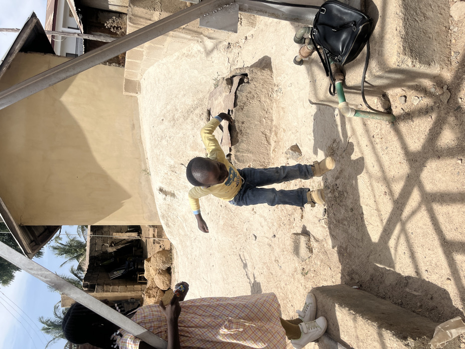 A low-angle outdoor shot shows a child in a yellow shirt and jeans climbing a concrete structure with a small opening. A woman wearing a plaid dress and white sneakers is near the bottom of the frame. A black bag hangs from a green metal pipe. The area appears to be a construction or residential site, with shadows from a metal structure visible on the ground.