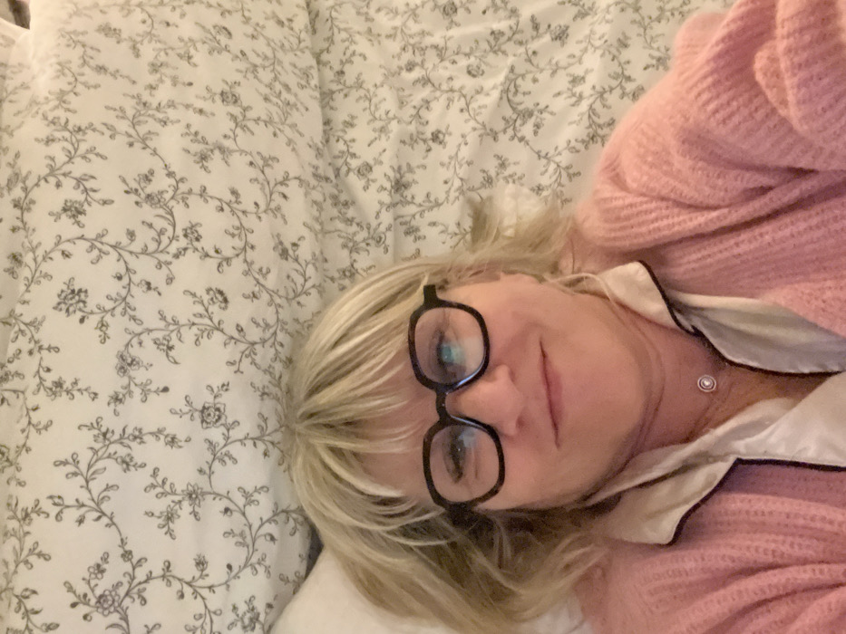 A fair-skinned woman with blonde hair and glasses is lying on a patterned bed. She is wearing a pink sweater over a white shirt with black trim. The bed has a white and grey floral pattern. She is looking directly at the camera. She is wearing a round pendant necklace.