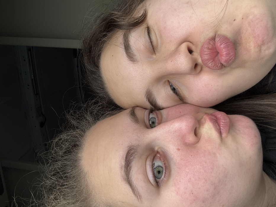 The image displays a close-up portrait of two female individuals, appearing to be young adults, positioned intimately cheek-to-cheek. The individual on the left side of the frame has fair skin exhibiting general redness on the cheeks and nose, light green-blue eyes that are wide open and directed towards the viewer, and light-colored, disheveled hair. Her lips are pursed in a slight pouting expression. A small, dark mole is present on her left cheek, below the eye. The individual on the right side of the frame has fair skin with visible pores and minor blemishes, dark brown wavy hair, and her right eye is closed in a wink while her lips are formed into a more pronounced pout. Both individuals have natural eyebrows and appear to be wearing dark-colored clothing, partially visible at the bottom edge of the frame. The background is dark and out of focus, showing only vague, indeterminate structural elements in the upper portion, consistent with an indoor environment. There are no visual elements within the image to ascertain its specific location within the city of Breda, Netherlands, or any other geographical area.