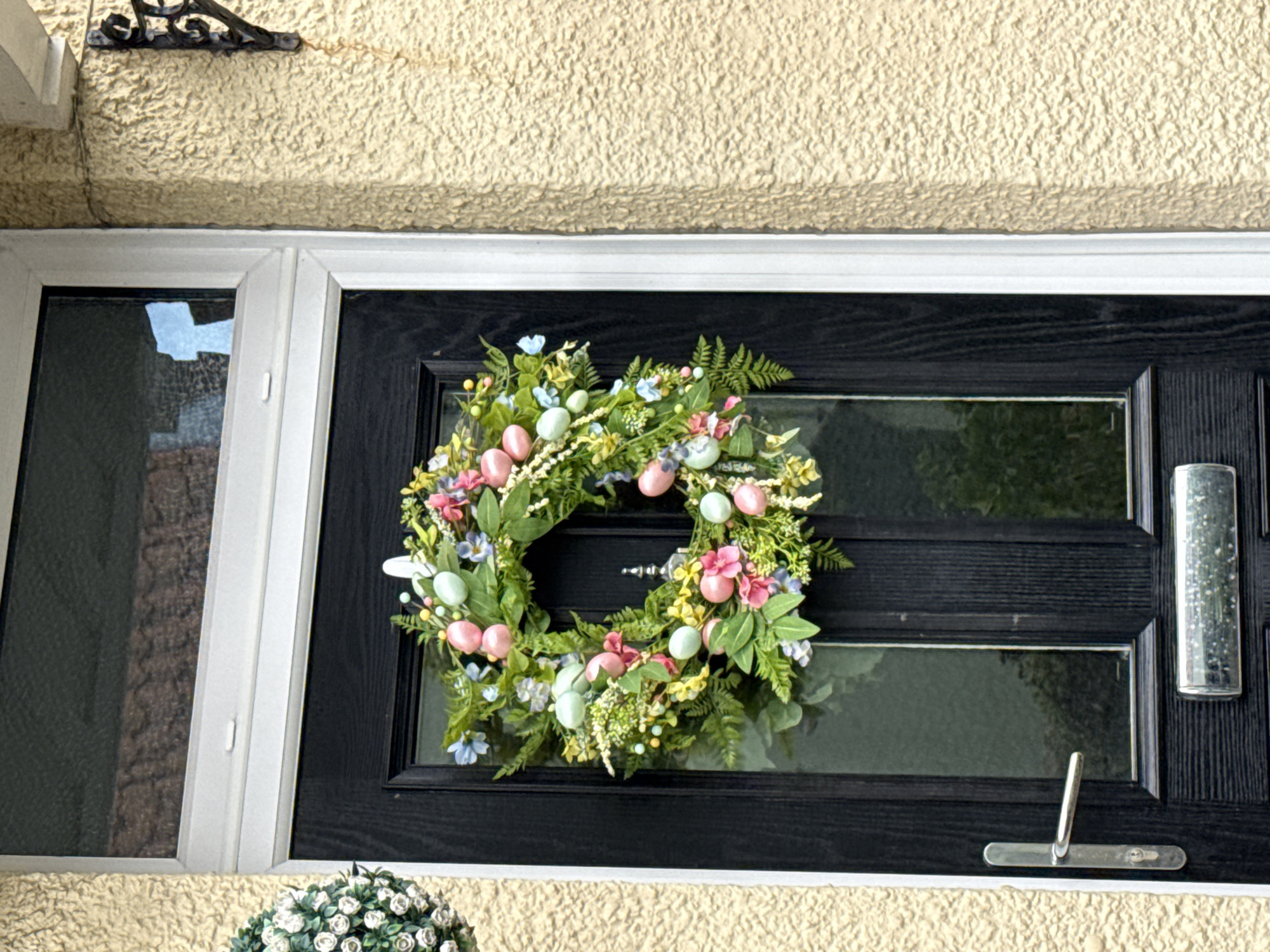 A close-up, sunlit view shows a decorated black door with a horizontal glass pane, attached to a white frame. The door is adorned with a circular Easter wreath featuring pastel-colored eggs, small flowers, and greenery. A silver handle and mailbox are visible on the door. The door is set against a textured, light-colored exterior wall. A decorative wrought iron fixture is partially visible at the top left. An object partially in the frame in the lower center of the image consists of a spherical potted plant with tiny white flowers. The location is presumed to be Gorleston-on-Sea, United Kingdom.