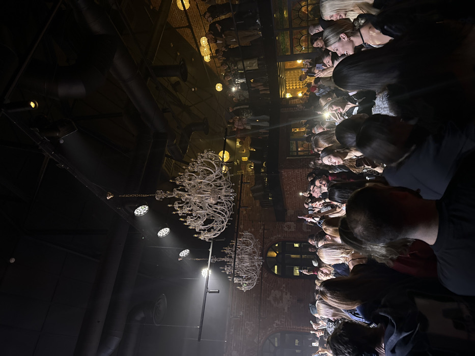 The image depicts a crowded indoor event venue, identified as **Main Stage (GlavClub)** at Ulitsa Ordzhonikidze, 11, building 1, **Moscow, Russia**. The scene is dimly lit, focusing on a large audience below two prominent, multi-tiered crystal chandeliers suspended from a high, dark ceiling. The ceiling features visible industrial ductwork and numerous LED stage lights emitting bright white beams through atmospheric haze. A dense crowd of individuals, primarily young adults, occupies the main floor, facing forward towards an unseen stage or focal point. Many in the crowd are holding smartphones aloft, with multiple camera flashes actively illuminating sections of the audience. Attire is predominantly dark. In the background, exposed red brick walls with large arched openings provide architectural texture. An elevated balcony or mezzanine on the right side of the frame hosts additional spectators, also observing the event. The overall environment is consistent with a concert, club night, or large public gathering in a renovated industrial-style space.
