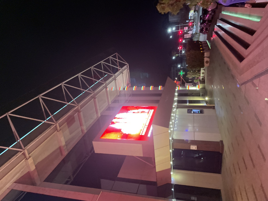 The image displays the exterior of a modern commercial building, identifiable as an entrance area, at night in Plovdiv, Bulgaria. The architecture resembles that of Markovo Tepe Mall. The dominant structure is a multi-story building featuring a facade composed of light-colored panels and dark glass. A large, rectangular LED screen is prominently mounted on the upper portion of the facade, displaying an abstract, dynamic image characterized by vibrant red and orange hues, resembling stylized flames or light bursts. Subordinate white text is faintly visible at the bottom of the screen. Above the screen, a white, open-truss architectural canopy or overhang extends, incorporating thin blue linear lights. To the right of the LED screen, a vertical architectural feature is illuminated with distinct horizontal bands of green, yellow, and red light. Below the LED screen, a recessed entrance area with dark double doors features a ceiling embedded with numerous small white lights. An ATM or information kiosk with a blue-lit screen is located to the right of these doors. In the foreground, a wide, light-colored paved area with a pattern of darker linear elements leads towards the building entrance. This pavement reflects a significant reddish glow emanating from the LED screen. To the lower right, a set of wide, angular steps or a ramp descends, illuminated by embedded green linear lights. Beyond the paved area and some low-lying shrubbery in planters, a multi-lane city street is visible in the background. The street is illuminated by several tall streetlights. Multiple red traffic lights are visible above an intersection, indicating a stop. Several dark-colored vehicles are parked or stationary on the street. A green cross sign, indicative of a pharmacy, is visible further down the street to the right. A partial, indistinct figure, possibly wearing a purple garment, is barely visible at the extreme lower right corner of the image, adjacent to the steps. The scene is characterized by extensive artificial lighting under a dark night sky, depicting an active urban commercial environment.