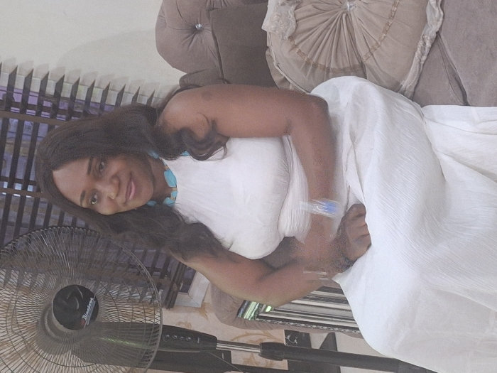 A female subject is depicted seated indoors in a domestic setting within the city of Barden Yana, Nigeria. The subject has dark skin, long, dark wavy hair, and wears a white, sleeveless maxi dress with a halter-neck. A prominent turquoise and white beaded necklace is visible around her neck. Her right hand, adorned with a light-colored ring, rests on her lap. She is seated on a brown upholstered sofa featuring tufted details and a round decorative cushion with ruffles. To the left of the subject, a dark Binatone brand standing fan is visible. Dark Venetian blinds are present in the background, suggesting a window, and the wall features a subtle patterned texture. The subject looks towards the viewer's left with a slight smile.