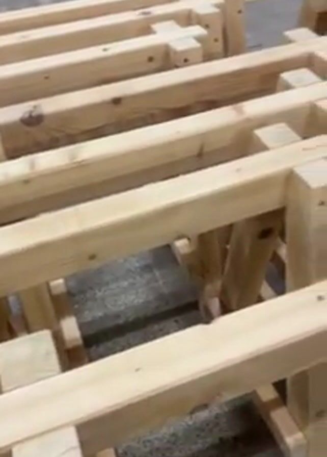 collection of wooden saw horses stacked together on a concrete floor. A tan, round lid is placed on one of the saw horses. The saw horses appear to be made of unfinished lumber. A wooden crate is visible in the background. The setting seems to be a warehouse or storage area.
