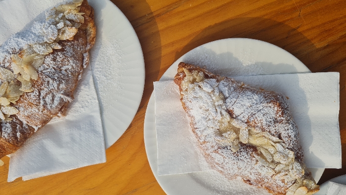 - "The image displays an overhead view of two almond croissants served on a light-colored wooden table" by FM-1TRqb2, licensed under CC BY 4.0