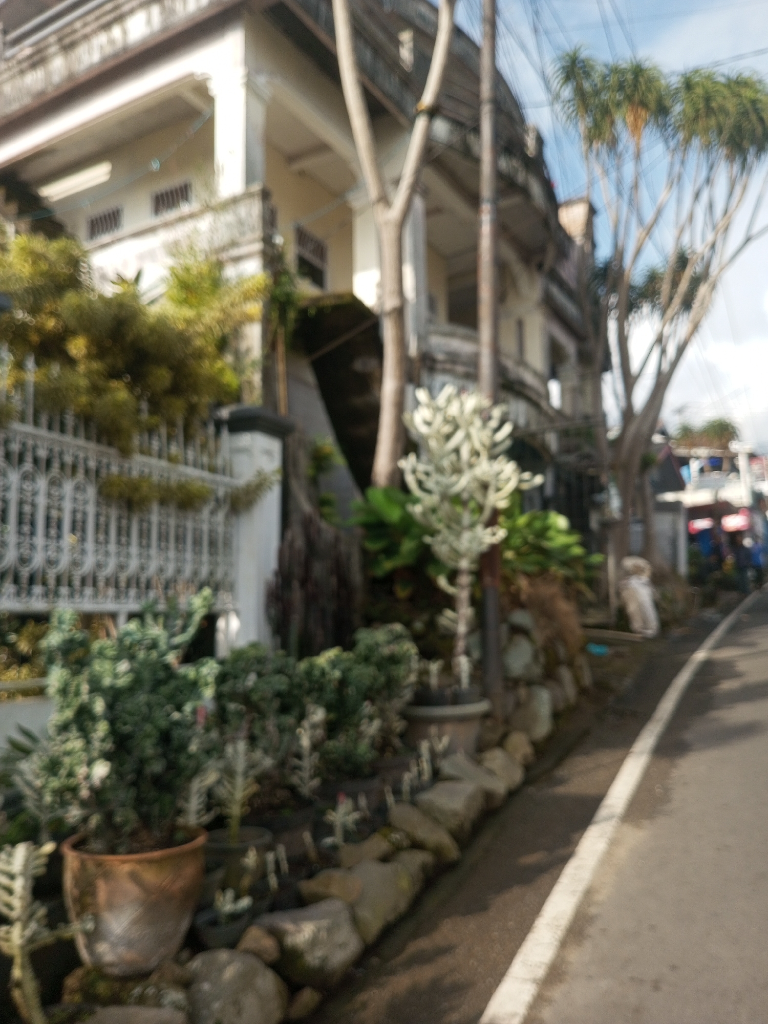 street scene in Mya Sit Kaing Ywar Thit, Myanmar. The view is somewhat blurred, but several elements are identifiable. A two-story building stands on the left side of the frame. It has a white facade with possible decorative columns. In front of the building is a wrought-iron fence partially obscured by greenery. A stone retaining wall lines the edge of the road, topped with potted plants and various foliage. A street runs along the right side of the image. Beyond the building and the line of trees, figures that appear to be people can be seen in the background, though their details are indiscernible. Utility poles and wires are also visible overhead.