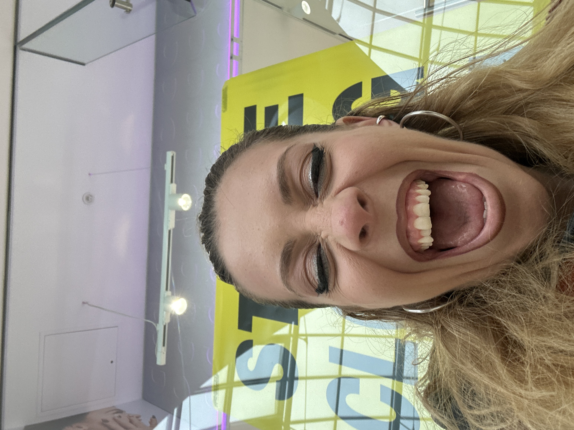 A photograph shows a woman with blonde hair, pulled-back and out-of-focus, opening her mouth wide, with her teeth showing. She is wearing large hoop earrings, and eye makeup. Behind the woman, at an angle, is a yellow sign with text that appears to be advertising "WEST" or "BEST" in large black and gray letters. In the background are glass windows and gray paneling with lights. The location appears to be an indoor, public area with other panels and decor indicating it may be a shopping center or similar commercial space, potentially in Dartford, United Kingdom, based on general architectural styles common to that area.