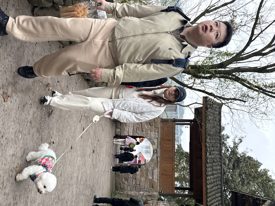 The scene takes place on a paved pathway in Beibei, China, under an overcast sky. In the foreground, an East Asian male of medium build walks towards the right. He wears a tan collared jacket with a dark blue polo emblem on the chest, tan sweatpants, and dark athletic shoes. Dark backpack straps are visible over his shoulders. His left hand holds a clear plastic bag containing numerous light brown, cylindrical snacks. His gaze is directed slightly upwards and to the left. Slightly behind and to his right, an East Asian female walks in the same direction. She wears a dark baseball cap, a light cream quilted jacket over a lighter-colored pullover, matching cream-colored wide-leg pants, and white sneakers. She has light pink gloves or mittens on her hands. In her right hand, she holds a white retractable dog leash. Connected to the leash, a small, fluffy white dog (appearing to be a Bichon Frise or similar breed) walks ahead of the woman, wearing a pink and green patterned harness. The path is concrete or packed earth, with scattered dry leaves. To the right, a traditional Chinese stone archway forms an entrance, topped by a wooden structure with a dark tiled roof. Beyond this archway, several indistinct individuals are visible, including one person wearing a pink jacket. Bare deciduous trees with sparse branches are prominent against the light grey sky on the left and center, while some green foliage is visible on trees further in the background. A bridge structure is faintly discernible in the far distance through the trees and structures.