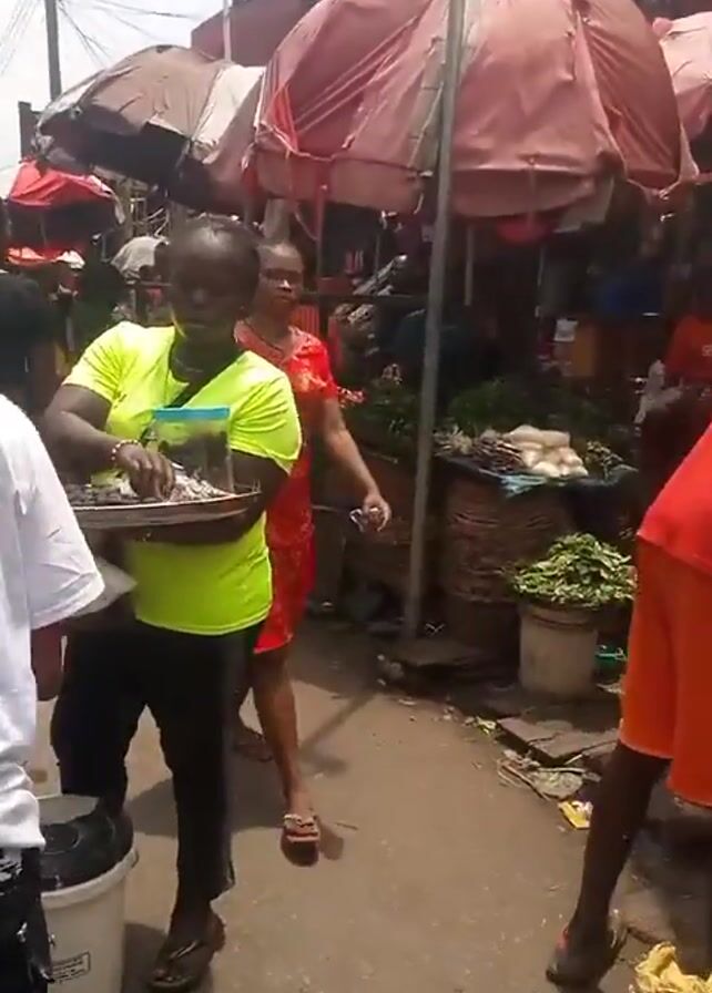 busy outdoor market scene during the day. People are walking and browsing through stalls with various items, including tomatoes and other vegetables. A woman in a bright yellow shirt is carrying a tray with small items. One of the people is wearing a white shirt, black shorts, and a backpack. The market has stalls covered with umbrellas and tarps, providing shade. A few vehicles are visible in the background. The general atmosphere appears to be crowded and bustling with activity.