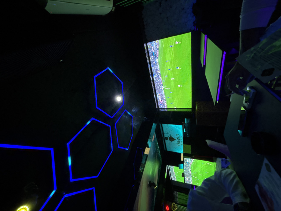 The scene depicts the interior of the "GRAND Lounge" in Sevlievo, Bulgaria. The environment is dimly lit with a dominant black ceiling featuring several hexagonal blue LED light fixtures and a single white circular ceiling light. Multiple large screens are visible, displaying a soccer (football) match on a green field with players in various team kits. One central screen prominently displays the "GRAND Lounge" logo against a teal background. In the foreground, a person's right arm and hand are visible, clad in a white long-sleeved garment. The hand holds a lit cigarette, with a small white box (possibly a cigarette pack) and a dark, cylindrical object (likely an ashtray) resting on a dark, rectangular table. To the left, a second person's upper torso and arm, also in a white long-sleeved garment, are partially visible, seated at another dark table. Tables in the midground feature glowing purple or pinkish-purple edge lighting. A light-colored chair is partially visible on the left. On the far right wall, near the ceiling, a light-colored air conditioning unit is mounted. The wall segment below the air conditioner and to the right of the main screen features a textured, white or light-colored decorative panel.