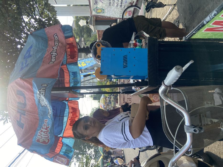 A woman in a white t-shirt and sunglasses poses near a bicycle with a front basket, partially obscuring the view. Behind her, a vendor's cart with a colorful umbrella labeled "Jihan Faadhirah A" and "Penjualan" is visible. A man in a black shirt bends over the cart. Signs and a bicycle are partially seen in the background. The text "JUMBO T GEN" is visible on a sign attached to the cart, as well as a sign with "Terapi" and "Lina Belzer". The image seems to be taken outdoors during the day.