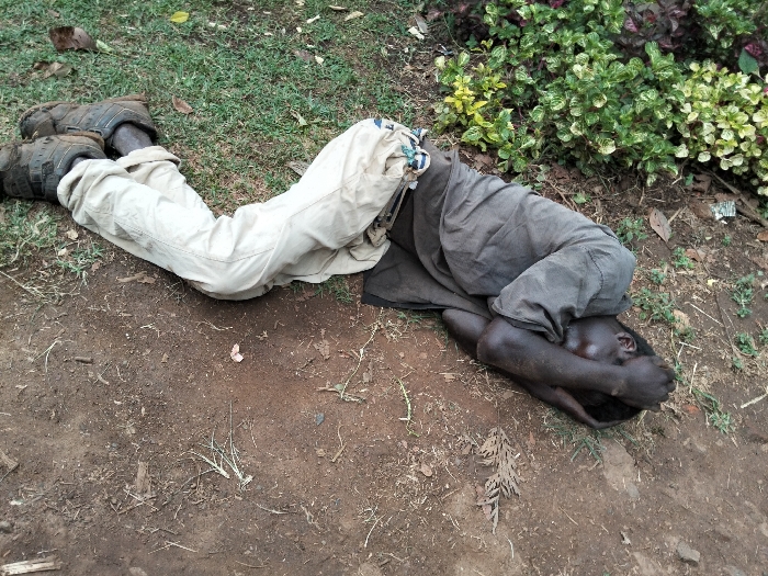 An adult male is observed lying on his right side on reddish-brown soil in Nyansiongo ward, Kenya