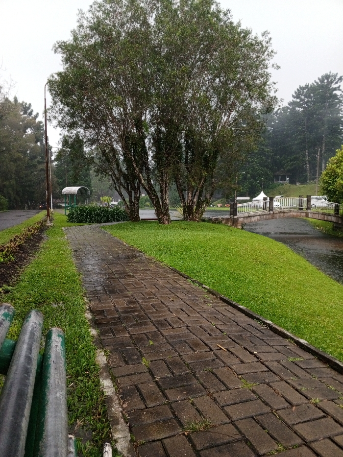 A wet, brick-paved path cuts through a green lawn with trees on either side