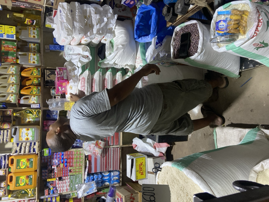 A person in a gray t-shirt and khaki shorts stands in a cluttered store. Shelves stocked with cooking oil and various goods line the left. Bags of grains, including beans and corn, are arranged on the floor around the person. A black phone is visible inside a bag of beans. Boxes and supplies fill the remaining space. The overall scene suggests a bustling retail environment.