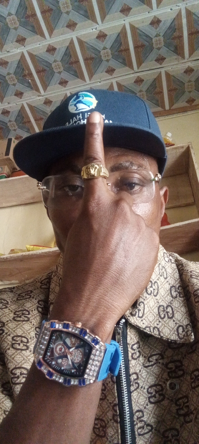 A dark-skinned individual is depicted in a close-up, selfie-style photograph taken indoors. The subject wears a dark blue baseball cap with a white and blue logo featuring a jumping aquatic animal and partially visible white text. Clear-rimmed eyeglasses with gold-colored accents are worn. The subject's left hand is raised, with the middle finger extended upwards, obstructing the view of their nose and mouth. A gold-colored ring with a prominent design, possibly a human head, is visible on the extended middle finger. The individual wears a brown or tan garment with a repeating dark brown "CG" or similar letter motif and a front zipper. A large, rectangular watch with a silver-toned casing embellished with numerous clear and blue simulated gemstones, and a light blue strap, is worn on the left wrist. The watch face features visible internal mechanisms. The background reveals a wall with a geometric patterned tile design in shades of brown, beige, and blue/grey in the upper portion, transitioning to a plain light yellow/beige wall. To the subject's right, a partial view of a rustic wooden shelving unit is visible, with an indistinct small object on it. The location is an unspecified indoor setting in Unknown, Unknown.