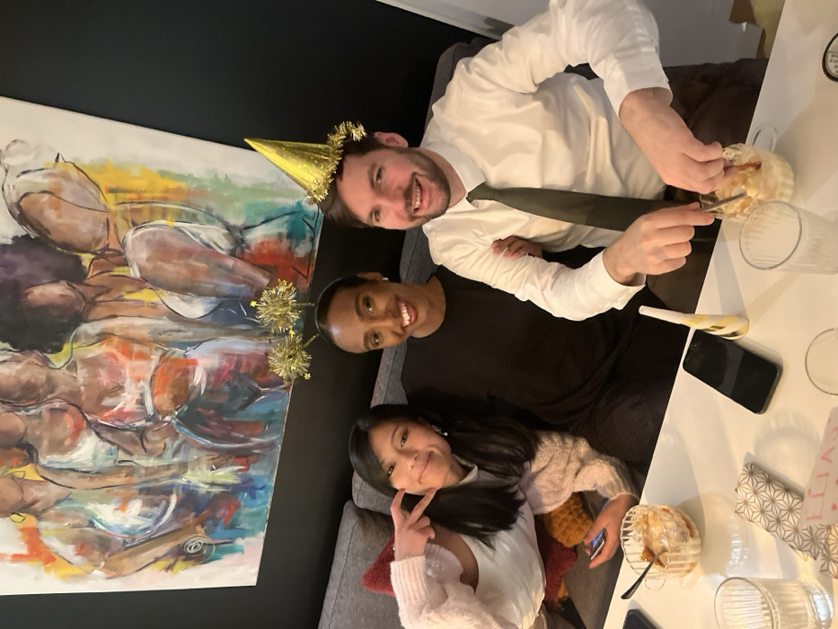 Three smiling individuals pose around a white table. A man in a white shirt and tie, wearing a gold party hat, holds a fork over a dessert. A woman in black sits next to him, wearing tinsel in her hair. Another woman in a light-colored sweater flashes a peace sign. On the table are desserts, glasses, and a smartphone. An abstract painting hangs on the wall behind them, adding color to the scene. They appear to be celebrating.