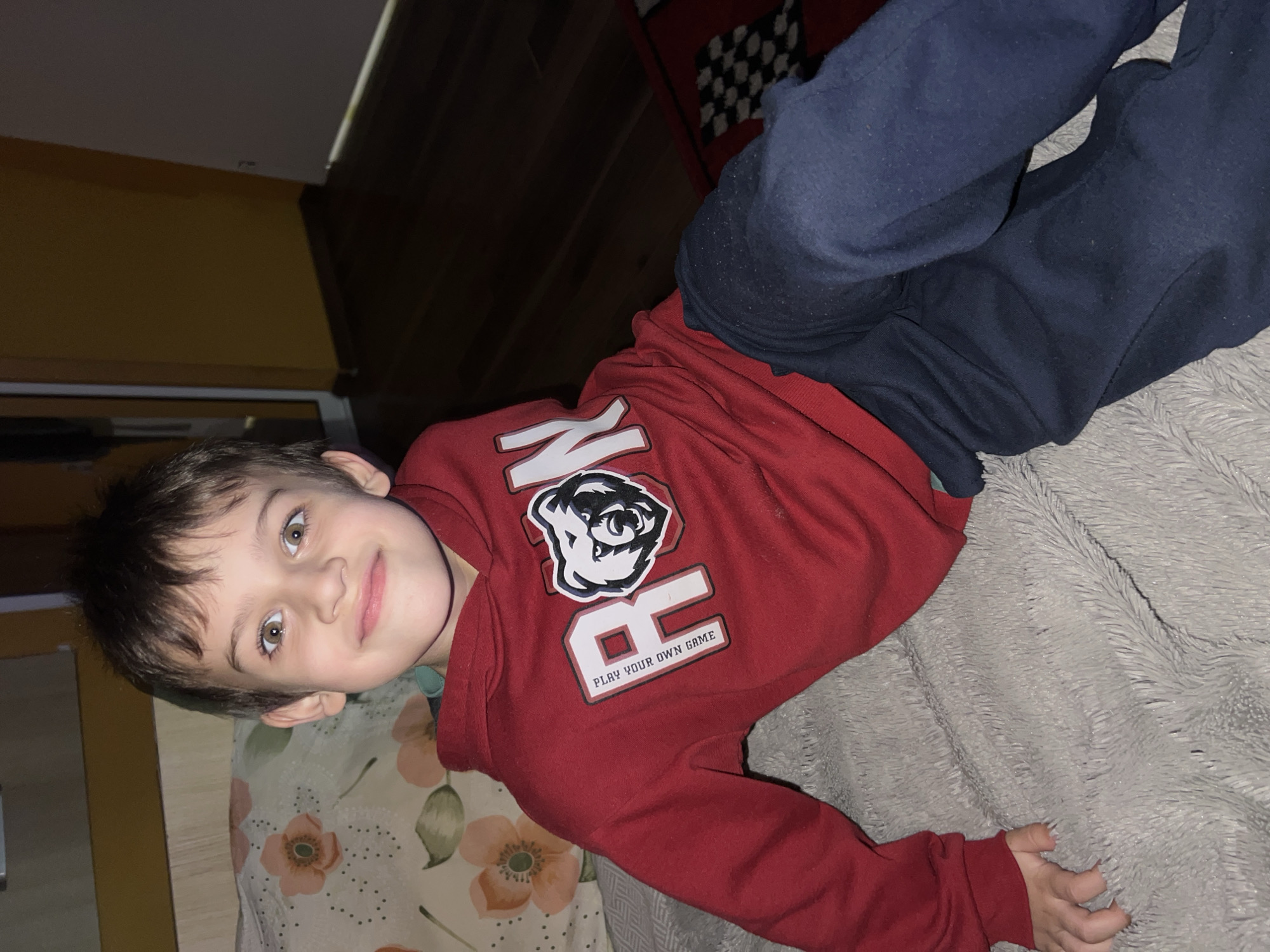 A young male individual, approximately 5-8 years of age, is seated or reclining indoors in Marten, Bulgaria. He has short brown hair and wide, light brown eyes, looking directly at the camera with a slight, lopsided smile. He is wearing a red hooded sweatshirt with "RON" printed in white block letters on the chest, where the "O" is replaced by a white bear head graphic outlined in black, and the text "PLAY YOUR OWN GAME" is vertically aligned beneath the "R". Dark blue sweatpants cover his lower body. He is positioned on a light grey, textured blanket or throw. To his upper left, a pillow or cushion with a peach-colored floral pattern is visible. The background features a solid mustard-yellow wall and a dark brown wooden floor. A white door frame is partially visible to the right, and a small section of a red rug with a black and white checkerboard pattern is visible on the floor in the lower right.