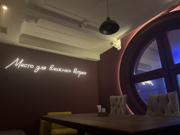 A dimly lit room features a maroon wall with a glowing neon sign in Russian, "Место для влажных встреч" (A place for wet meetings)