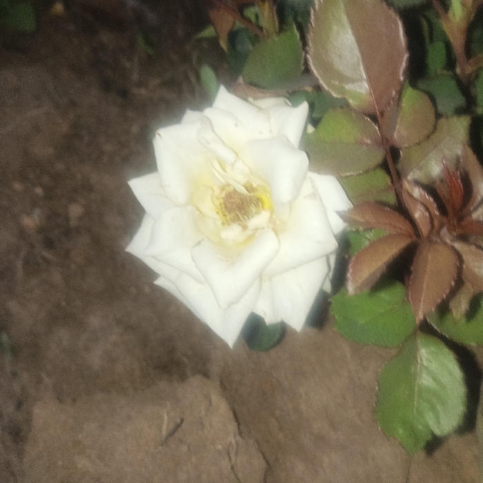 A white rose with a yellow center blooms near brown foliage. The rose petals appear delicate and tightly layered. The leaves range in color from dark green to reddish-brown. Below the rose is a coarse, brown surface suggesting soil or a rocky terrain. The overall lighting in the photograph is subdued, casting shadows that emphasize the textures of the flower and its surroundings.