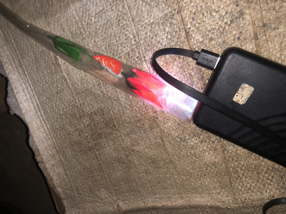 A black power bank is charging a clear, thin, flat, plastic device, possibly a display, with a built-in USB charging cable plugged into the power bank. The plastic device contains at least three artificial flowers, colored green, red and red, inside. The display is lit with a bright light, possibly from an LED, emanating from the end connected to the power bank. The background appears to be a tan, woven surface.